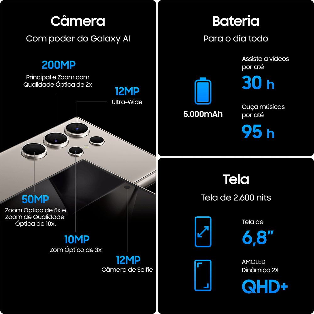 Mesmo entrando no próximo ano, o S24 Ultra segue no topo do desempenho mundial. Seu processador, tela de 6,8 polegadas com taxa de atualização adaptativa e o conjunto de câmeras de alto nível mantêm o aparelho entre os mais poderosos disponíveis. Nada nele “fica devendo” para 2025. Ele continua pronto para jogos, edição de vídeos, produtividade intensa e uso diário sem limitações. É um investimento que se mantém forte por muito tempo — ainda mais com suporte até 2031.